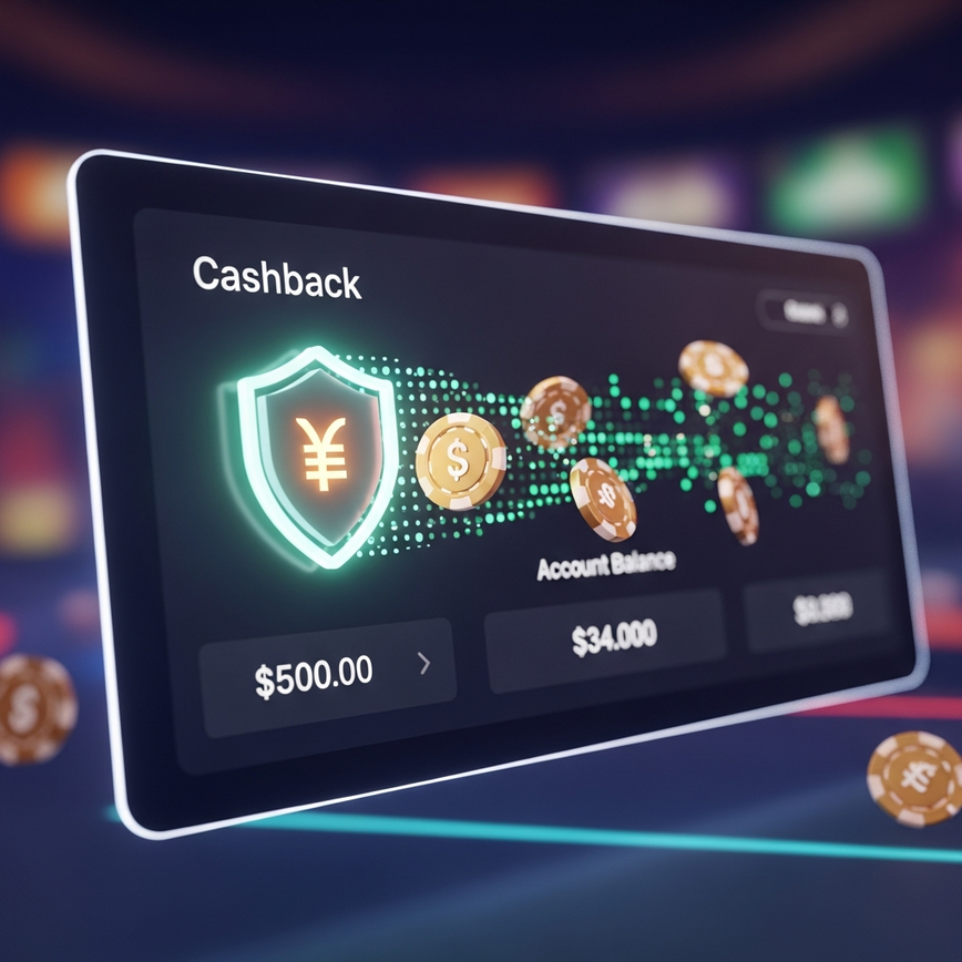A modern online casino interface showcasing a prominent cashback feature with a digital shield icon and virtual chips flowing into an account balance, symbolizing bankroll protection on a premium online gaming platform.