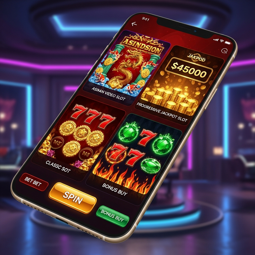 A modern mobile online casino interface displaying popular slot games in Malaysia, including Asian-themed, classic 777, and progressive jackpot slots, set against a luxurious digital backdrop.