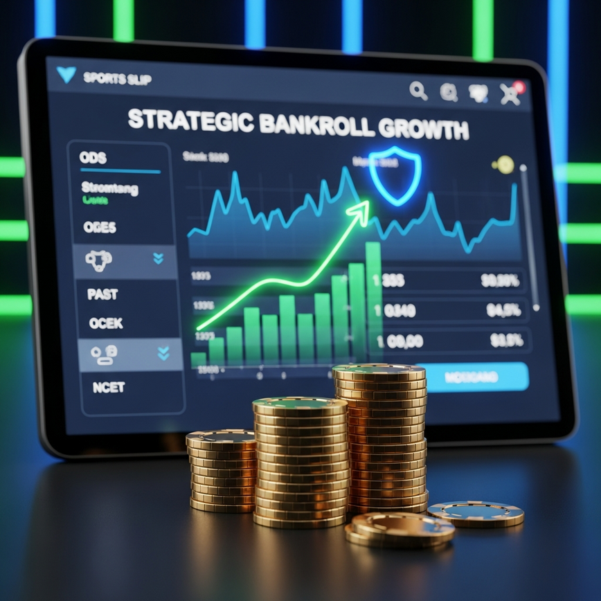 Sleek digital sports betting interface with an overlaid upward-trending financial graph and a protective shield, symbolizing strategic unit sizing and bankroll management for long-term profit.